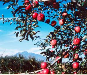 | 藤崎町は、青森県津軽平野のほぼ中心に位置し、弘前市を隣に、「津軽の母」と称される岩木川と支流の平川、浅瀬石川が合流する地点にあり、平坦で肥沃な土壌に恵まれ、りんごを中心とする農業の町として栄えてきました。 今や味、生産量とも世界一のりんご「ふじ」は、藤崎町で昭和14年の交配から始まり、気の遠くなるような長い時間と根気をかけて、昭和33年に東北7号として発表され、昭和37年に藤崎町の「藤」、日本一の富士山の「富士」を絡めて「ふじ」と命名されたものです。 |